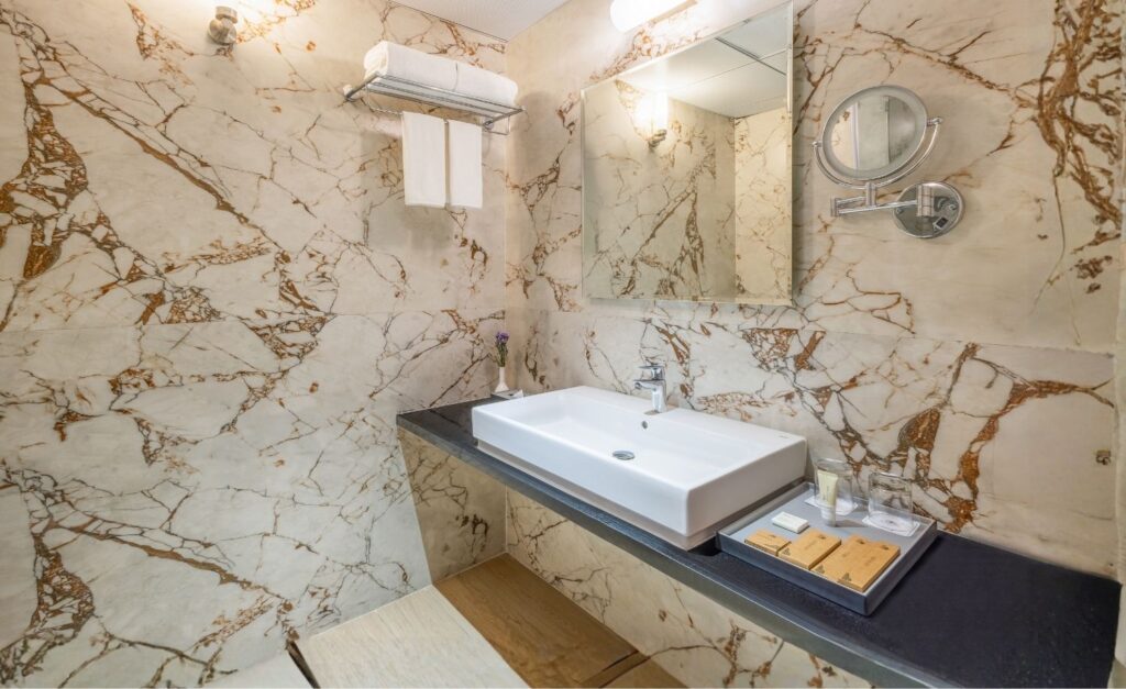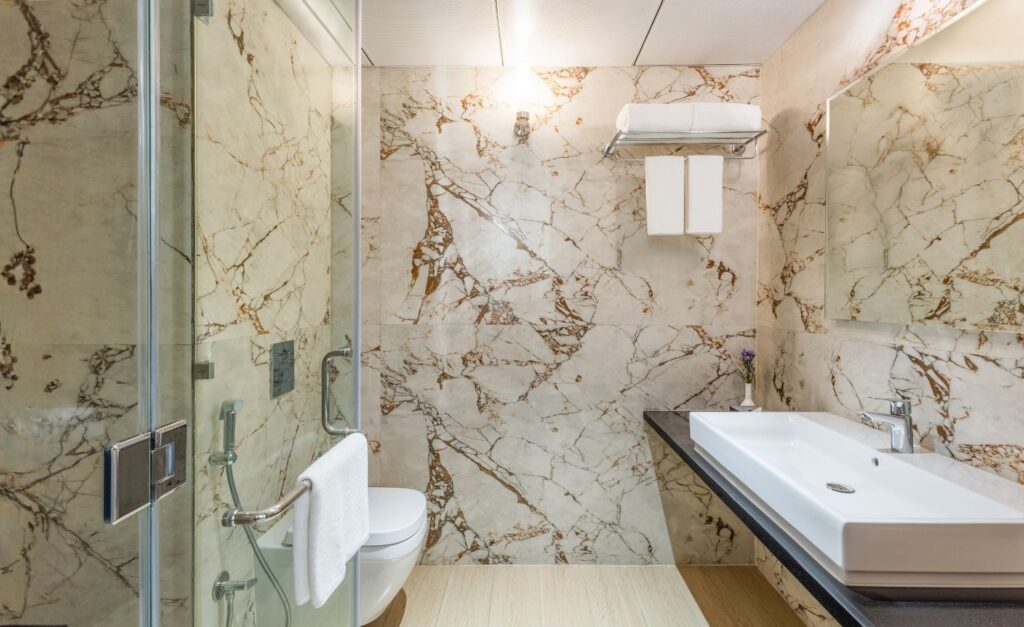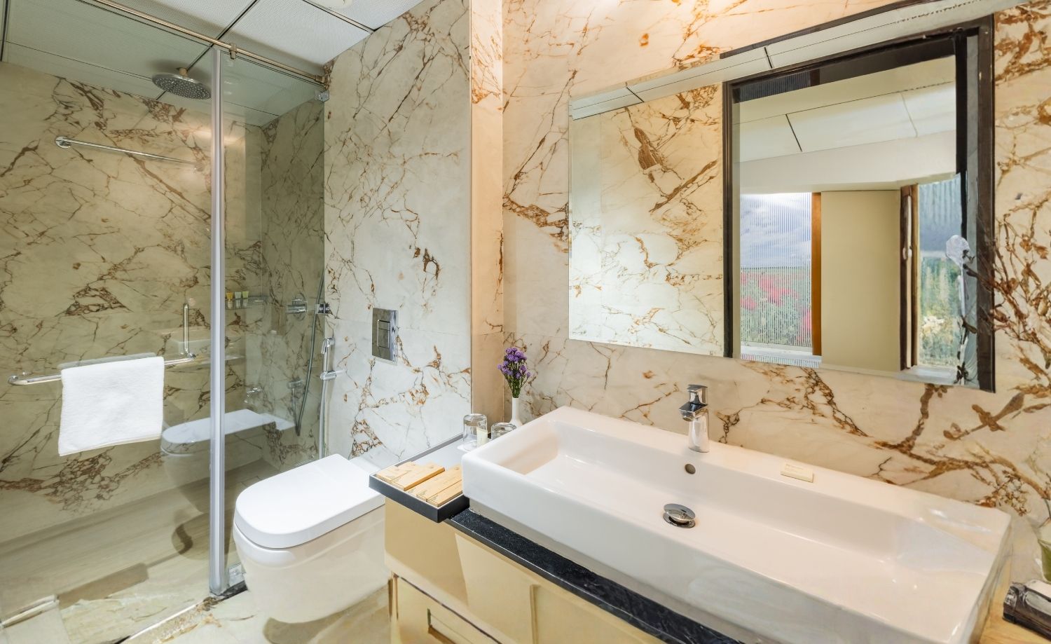 The opulent washroom is beautifully designed with a modern shower cubicle (or bathtub, if applicable), premium toiletries, and fresh towels, offering a rejuvenating and spa-like experience. With its sophisticated interiors, ambient lighting, and contemporary luxury, the Royal Suite embodies the perfect harmony of comfort, style, and exclusivity.