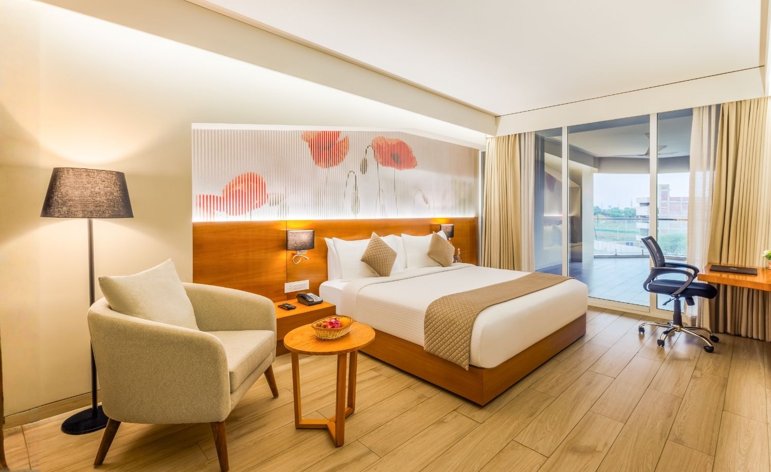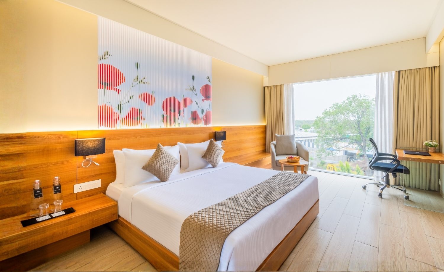 Deluxe Twin Room at Sunrise Grand Neemuch offers 300 square feet of thoughtfully designed space, blending contemporary elegance with everyday comfort. Ideal for business travellers, colleagues, friends, or family members traveling together, the room features comfortable twin beds set within a modern and soothing interior palette.