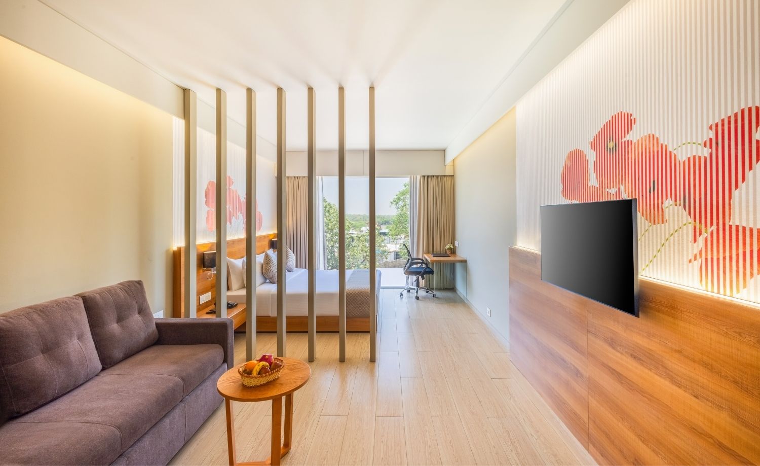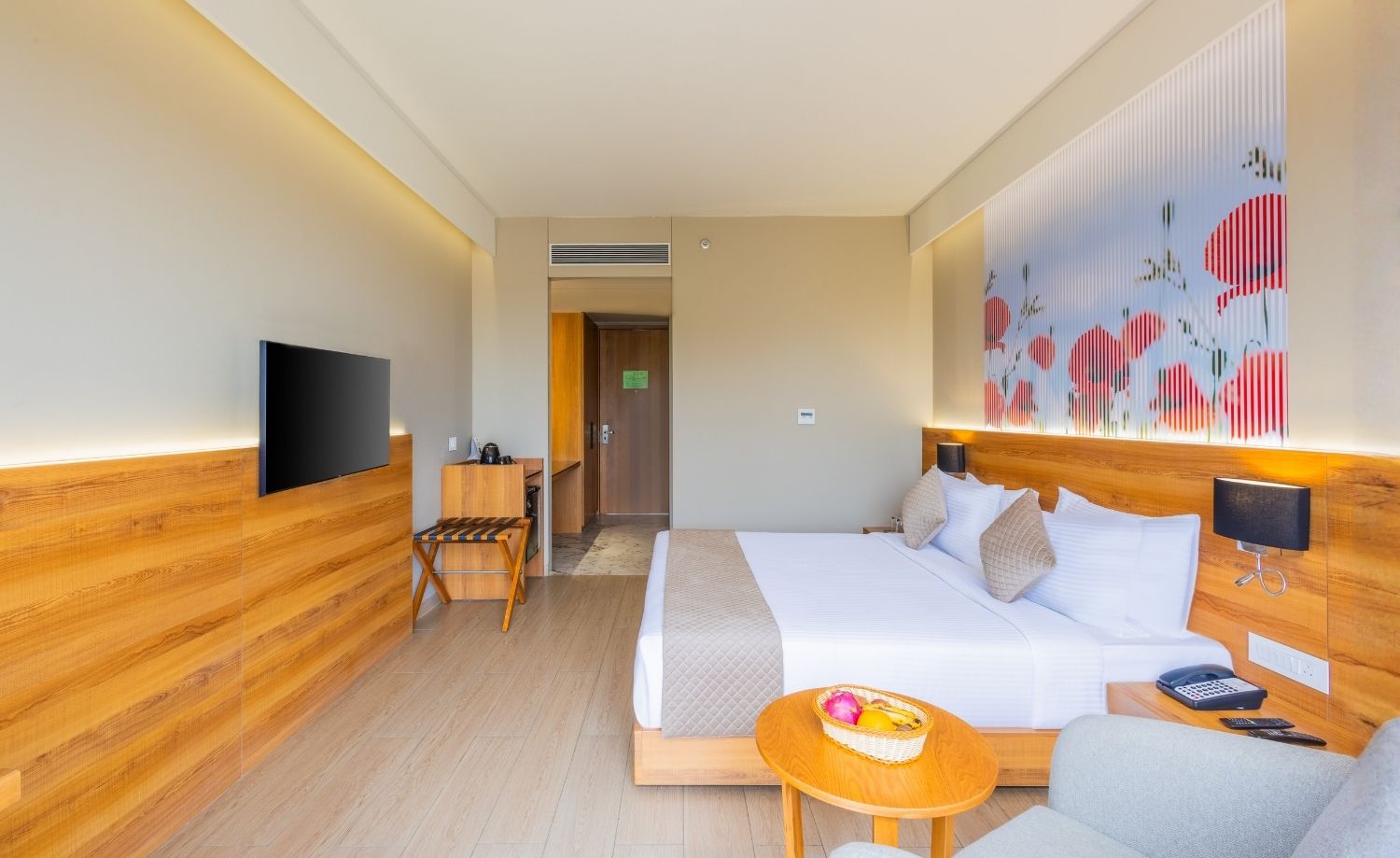 Enjoy a range of modern in-room amenities including a flat-screen TV, tea/coffee maker, mini refrigerator, dedicated work desk, wardrobe, and complimentary high-speed Wi-Fi for your convenience.