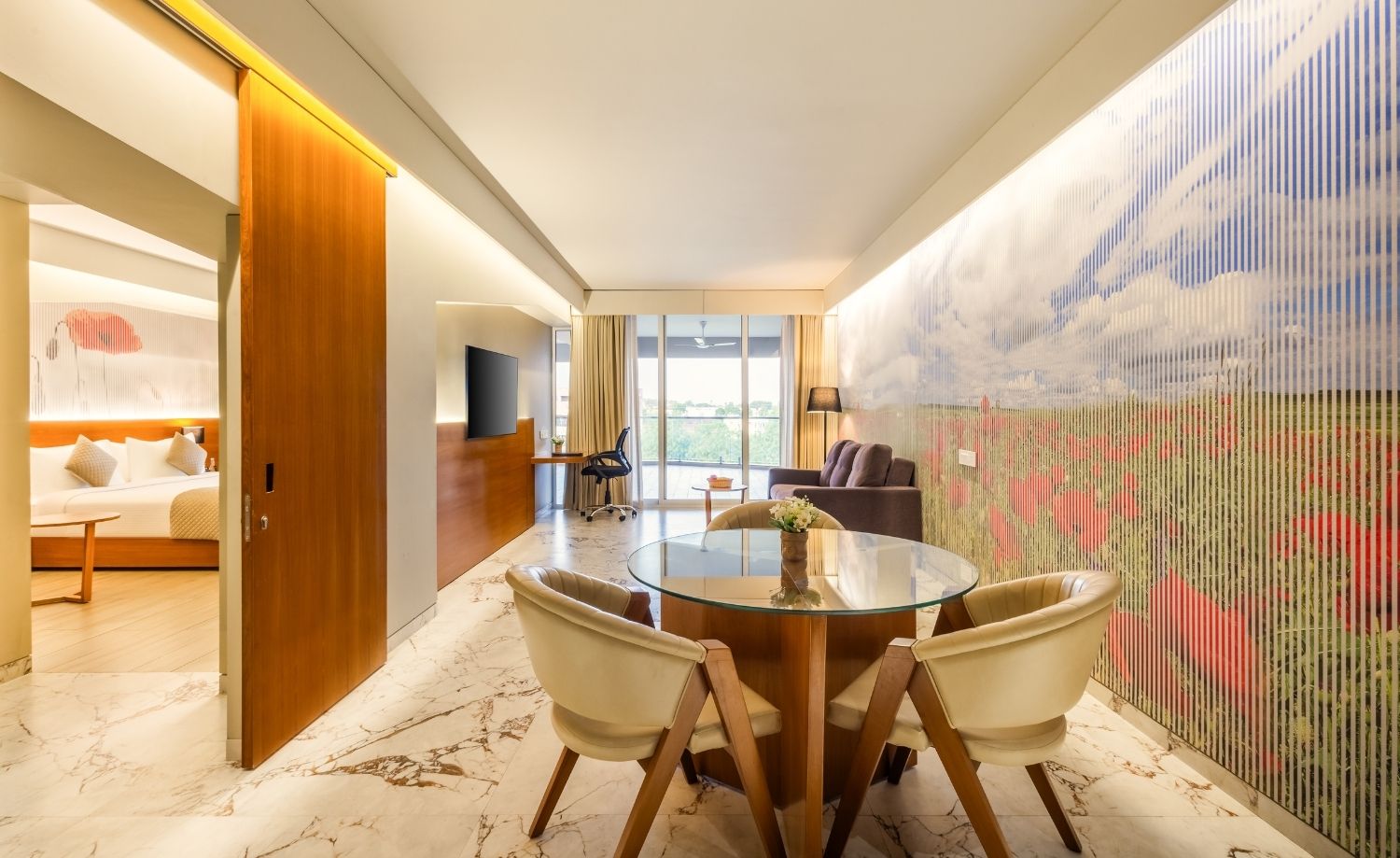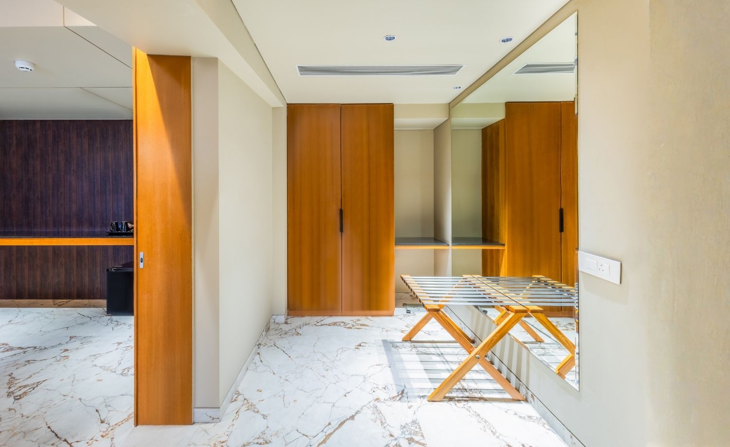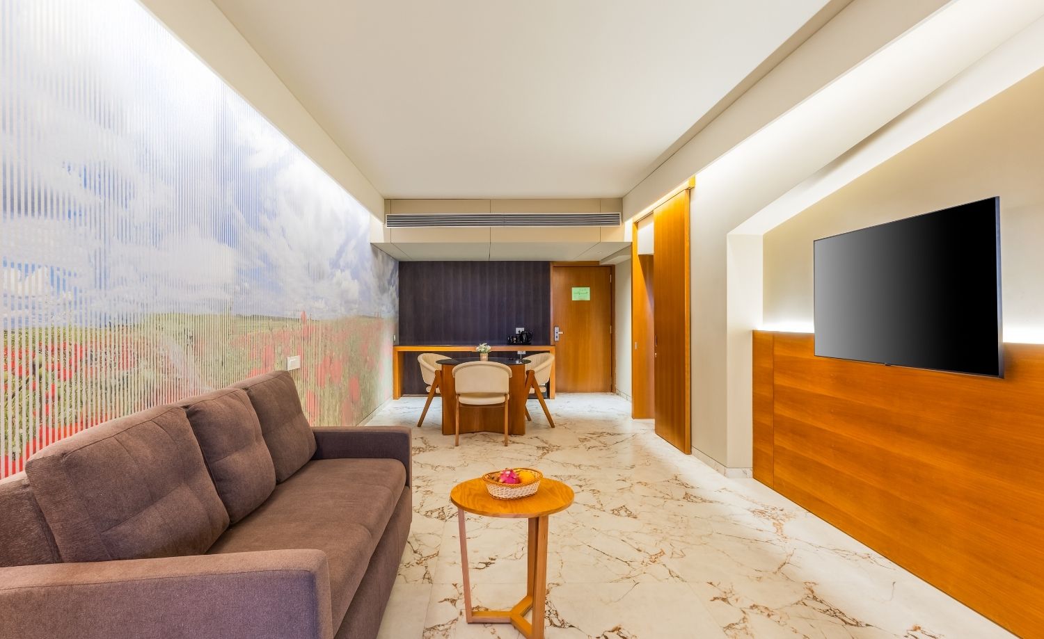 Thoughtfully curated for elegance and convenience, the Royal Suite offers an array of upscale in-room amenities including a large flat-screen TV, tea/coffee maker, mini refrigerator, dedicated work desk, spacious wardrobe, and complimentary high-speed Wi-Fi. The suite also provides an expansive living area, creating the perfect setting for relaxation or private meetings.